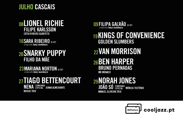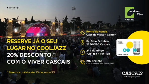 Nesta edição do COOLJAZZ, a Câmara Municipal de Cascais em parceria com o festival, apresenta um desconto exclusivo para os utilizadores do Cartão Viver Cascais. Residentes, trabalhadores ou estudantes, com perfil ativo, têm a possibilidade de adquirir bilhetes com 20% de desconto. Este benefício é válido até 25 de junho, poderão adquirir os bilhetes no Cascais Visitor Center. Mais informações aqui.